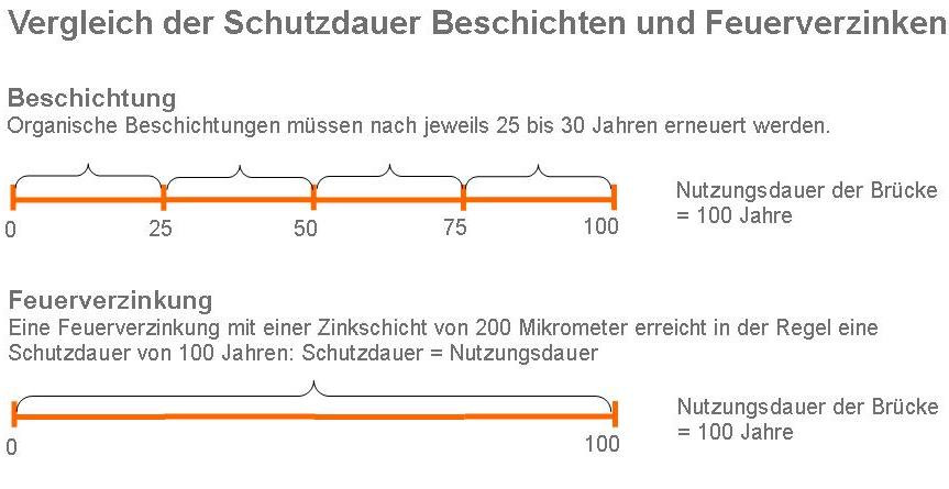 Für Brückenbauwerke wird in der Regel eine Lebensdauer von mindestens 100 Jahren gefordert. Werden Stahl- und Verbundbrücken durch Beschichten vor Korrosion geschützt, dann ist die Beschichtung erfahrungsgemäß nach rund 25-30 Jahren zu erneuern. Bezogen auf 100 Jahre sind neben einer Erstbeschichtung in der Regel drei Erneuerungsbeschichtungen erforderlich, die nicht nur Kosten sondern zumeist auch erhebliche Verkehrsstörungen verursachen. Kommt eine Feuerverzinkung zum Einsatz, so ist bei Zinküberzugsdicken von mindestens 200 Mikrometer eine Korrosionsschutzdauer von 100 Jahren in der Regel erreichbar.