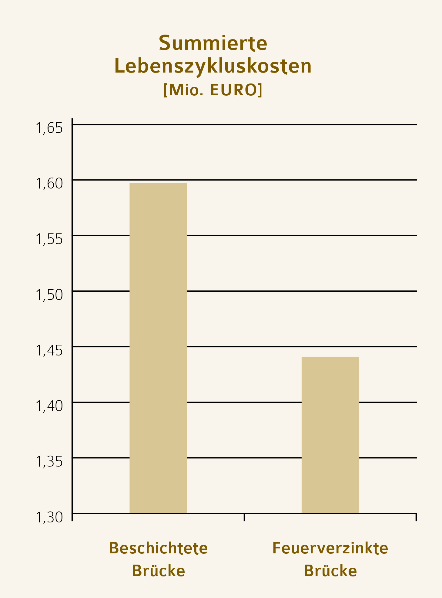- Bei den Erstkosten, d.h. den gesamten Erstellungskosten des Bauwerkes war die feuerverzinkte Brücke ca. 0,5 Prozent günstiger. Im Hinblick auf die gesamten Lebenszykluskosten, die sämtliche Kosten von der Erstellung über die Wartung- und Instandhaltung bis zum Rückbau betrachtet, war die feuerverzinkte Brücke rund 10 Prozent günstiger als die beschichtete.
