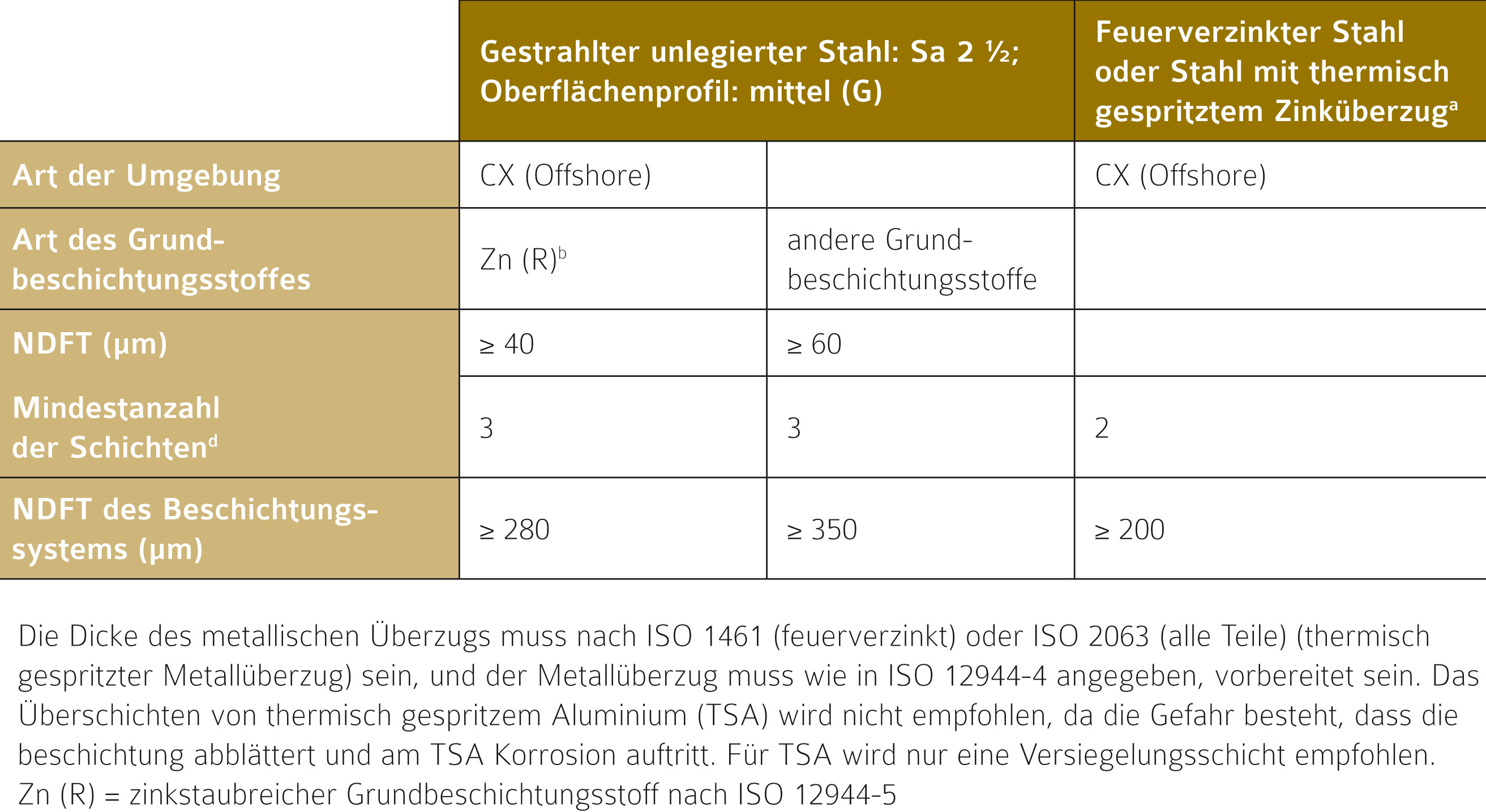 Die überarbeitete Beschichtungsnorm DIN EN ISO 12944 trägt der Langlebigkeit von feuerverzinktem Stahl zumindest ansatzweise Rechnung und ermöglicht um ein Drittel dünnere Beschichtungen auf feuerverzinktem Stahl und erlaubt dies auch bei hochkorrosionsbelasteten Offshore-Anwendungen. Vergleicht man die Anforderungen für die Korrosivitätskategorie CX (Korrosionsbelastung: extrem), zu der Offshore-Bereiche mit hoher Salzbelastung wie beispielsweise Ölplattformen und Windparks, aber auch Industriebereiche mit extremer Feuchtigkeit und aggressiver Atmosphäre gehören, dann zeigt sich, dass Beschichtungen auf feuerverzinktem Stahl dünner und mit weniger Schichten ausgeführt werden können. Die Mindestanzahl der Schichten wird hier mit 2 und die Mindestsollschichtdicke auf den metallischen Überzügen wird mit ≥ 200 µm angegeben.