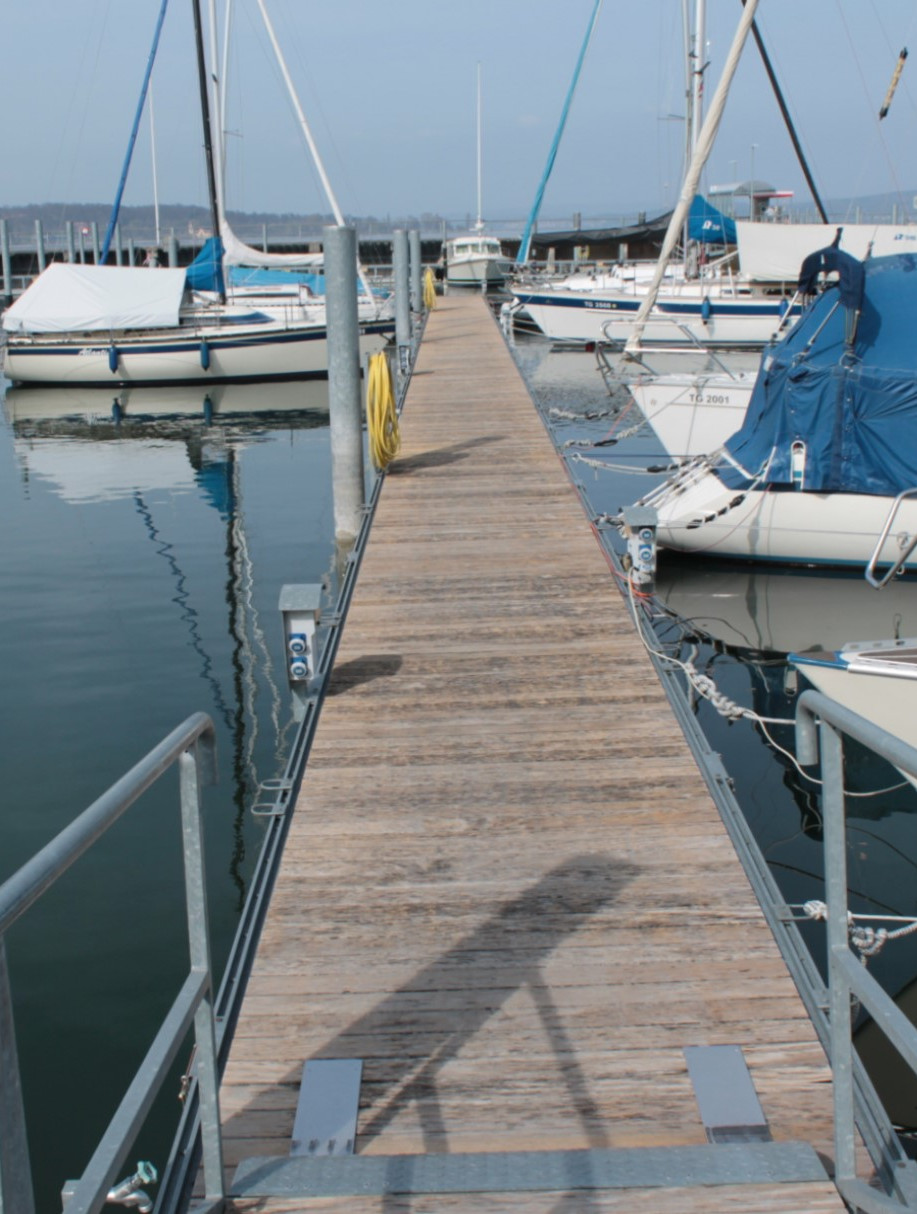 In Bottighofen am Bodensee wurde im Jahr 1968 eine neue Hafenanlage errichtet, zu auch eine rund 150 Meter lange aus feuerverzinkten Spundwandbohlen bestende Hafenbeckenbegrenzung gehört. Bei vor Ort Inspektionen der Spundwände in den Jahren 1983, 2006 und 2014 zeigten sich diese auch im Zeitverlauf in einem sehr guten Zustand. Im Bereich der Wasserwechselzone waren Sielbeläge und Algenbewuchs auf den Spundwänden festzustellen, jedoch keine Grundwerkstoffkorrosion. Im atmosphärisch beanspruchten Überwasserbereich wurden in 2014 an den 46 Jahre alten Spundwandbohlen Zinkschichtdicken von 65 – 90 µm ermittelt.
