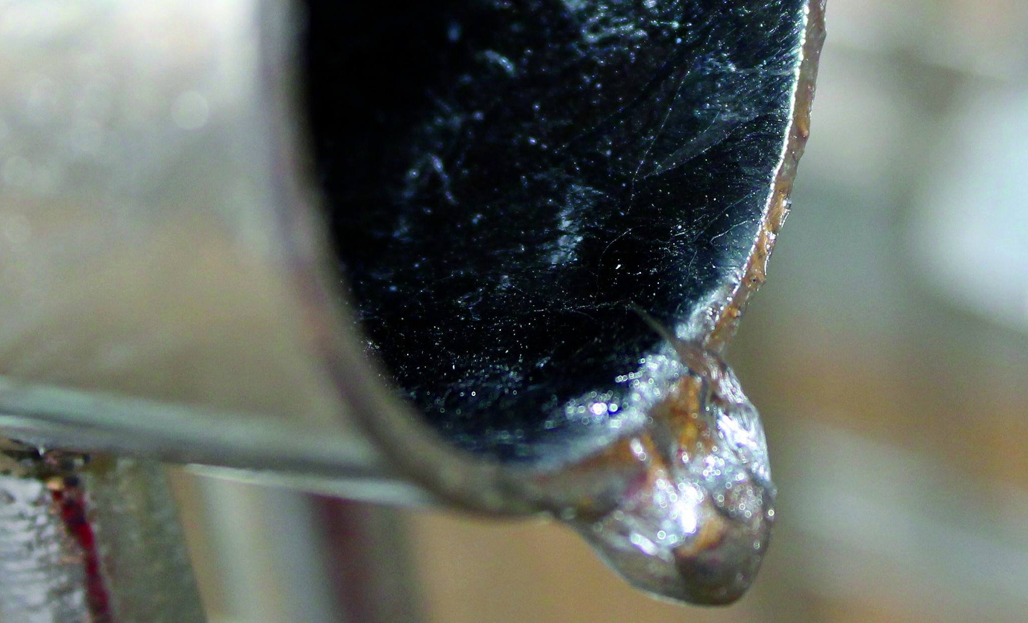 Beim Feuerverzinken werden Stahlteile nach entsprechender Vorbehandlung in ein Bad mit schmelzflüssigem Zink getaucht. Wie jede andere Flüssigkeit auch, tropft das (über-) flüssige Zink ab. Es kann dabei vorkommen, dass das abfließende Zink erstarrt und kleine Verdickungen oder Tropfnasen bildet. Für typische Anwendungsfälle sind leichte Verdickungen durch Tropfnasen unproblematisch und sollten demnach auch verbleiben, da eine Nacharbeit der Stellen auch zur Beschädigung des Zinküberzuges führen kann. Vorsicht ist in diesem Zusammenhang beim Arbeiten mit dem Winkelschleifer geboten. Dabei besteht die Gefahr, dass der Zinküberzug völlig abgeschliffen wird und der blanke Stahl freiliegt. Ein Bearbeiten mit der Feile in Handarbeit oder ein mechanisches Schleifen mit Hilfe eines Winkelschleifers und einer flexiblen Scheibe sind zweckmäßiger. Eine weitere Möglichkeit ist das Abschmelzen des überflüssigen Zinktropfens mittels Flamme. Mit einer weichen Flamme wird der Zinküberzug lokal aufgeschmolzen (nicht verbrannt). Wird das Zink flüssig, tropft es entweder von selbst ab, oder es kann mit Hilfe einer Drahtbürste oder eines Blechspachtels beseitigt werden (Abb. I). Wenn es aber darum geht, Stahlteile passgenau zusammenzufügen oder zu montieren, kann ein Nacharbeiten dieser Stellen erforderlich werden. In jedem Fall sind Zinkverdickungen oder Tropfnasen aber zu entfernen, wenn sie sehr spitz sind und wenn von ihnen beim Transport, der Montage oder beim späteren Gebrauch eine Verletzungsgefahr ausgeht (Abb. 3).