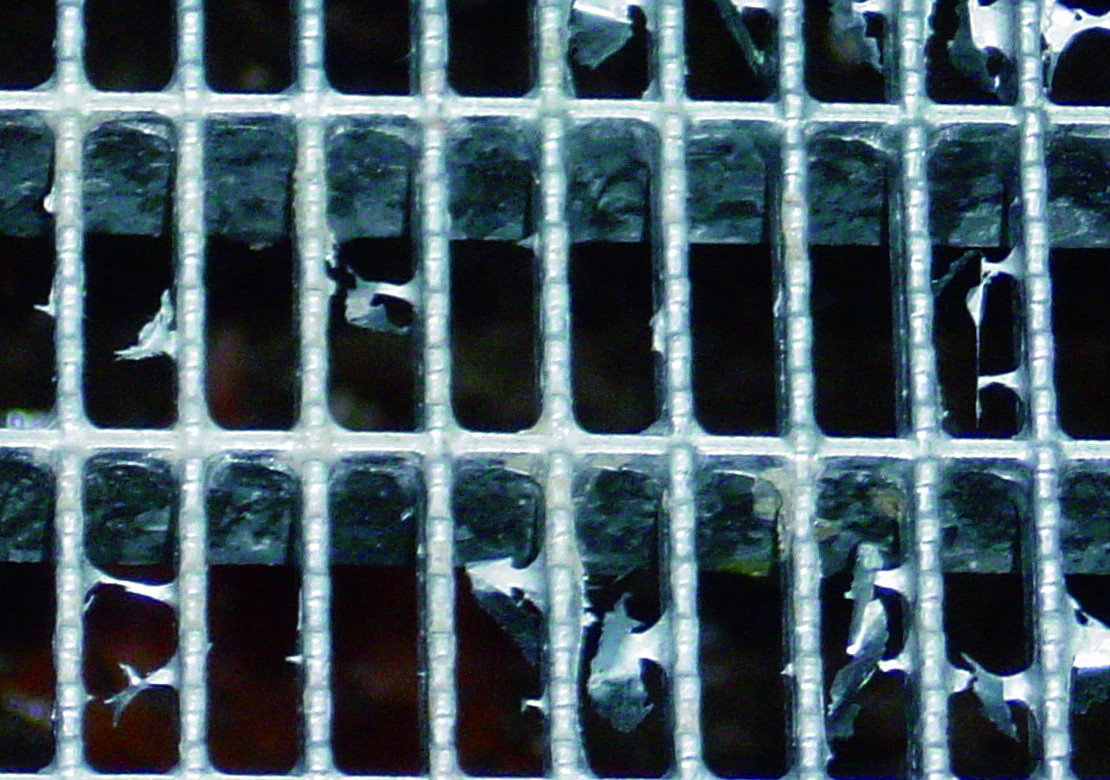 Beim Herausziehen von Stahlteilen aus der Zinkschmelze läuft überflüssiges Zink zurück in die Schmelze. Das flüssige Zink reagiert jedoch rasch mit der Umgebungsluft und bildet auf der Oberfläche eine dünne Oxidhaut. Bei bestimmten Bauteilen (z. B. Rahmen mit Welldrahtgeflecht, Gitterroste) kann es mitunter vorkommen, dass in einigen Ecken folienartiger Zinkflitter zurückbleibt (Abb. 5).