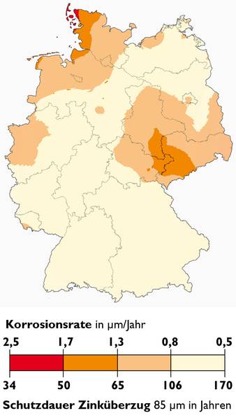 Eine Schutzdauer von 50 Jahren und mehr ist die Regel. Dies belegen unter anderem die vom Umweltbundesamt herausgegebene Zinkkorrosionskarte (Abb.), die Tabelle „Nutzungsdauern von Bauteilen zur Lebenszyklusanalyse des Bewertungssystems Nachhaltiges Bauen für Bundesgebäude (BNB)" des Bundesbauministeriums sowie unzählige Praxisbeispiele.