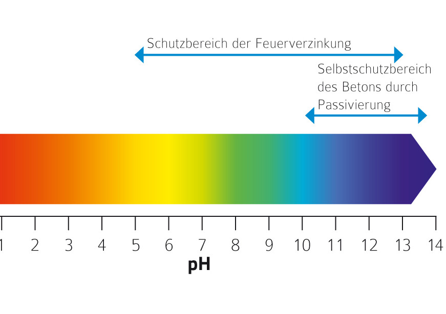 In der Regel bedarf Betonstahl keines zusätzlichen Schutzes, denn er wird durch die hohe Alkalität des Betons passiviert und damit geschützt. Dieser Schutz ist bei einem pH-Wert zwischen 10 und 13,8 gegeben. Unter ungünstigen Bedingungen geht dieser Schutz jedoch verloren - der Betonstahl korrodiert und es entstehen schleichend nur schwer oder gar nicht sanierbare Bauschäden. Durch Feuerverzinken des Betonstahls kann Bewehrungskorrosion sicher verhindert werden.