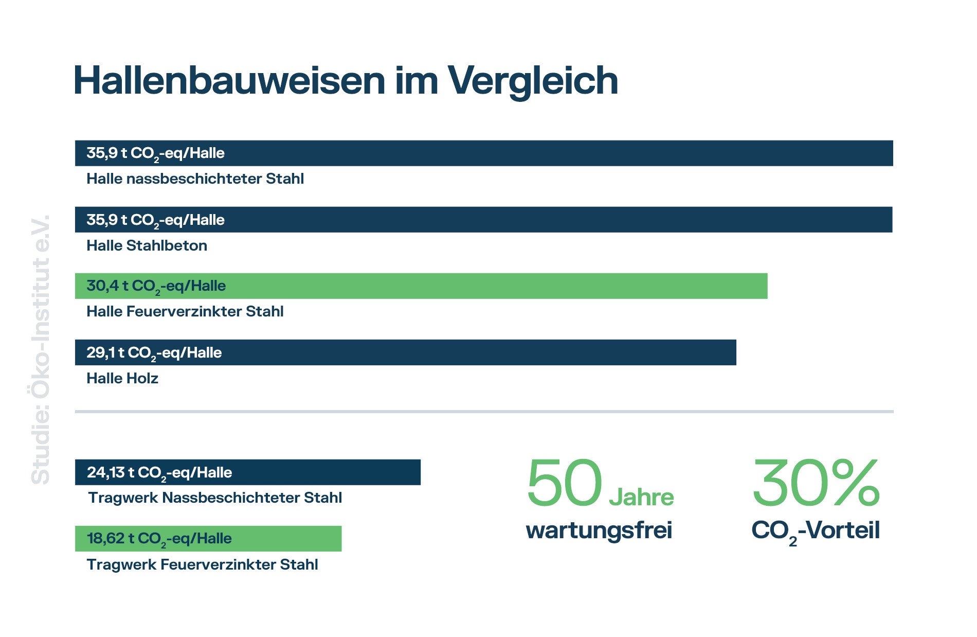 Das rennomierte Öko-Institut hat eine Vergleichsstudie zur Umweltverträglichkeit von verschiedenen Hallenbauweisen über den Lebenszyklus durchgeführt. Verglichen wurden die Bauarten mit feuerverzinktem Stahl, nassbeschichtetem Stahl, Stahlbeton und Holz.