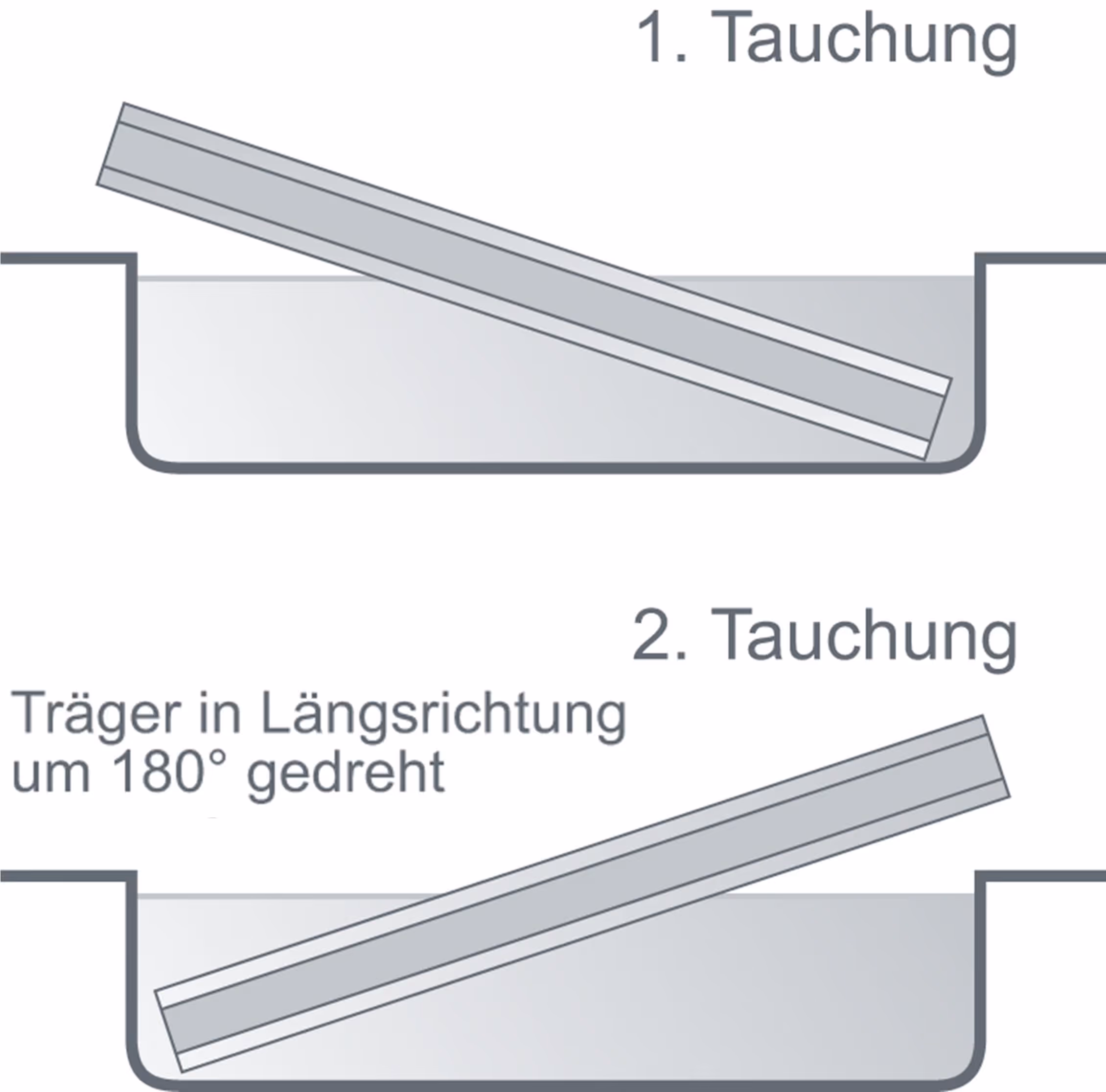 Unterschiedliche Erwärmung ist bei mehrfachem Tauchen unvermeidlich, da sich nur ein Teil der Konstruktion in der 450 °C heißen Zinkschmelze befindet. Die Folge ist eine unterschiedliche Ausdehnung der Ober- bzw. Unterseite des Bauteils.Der Überlappungsbereich ist beim Mehrfachtauchen zumeist sichtbar. Mehrfachtauchen (Abb.1) von langen, schlanken Stahlteilen (z. B. Walzträger) ist relativ problemlos, da sich nur geringfügige Unterschiede in der Wärmedehnung der Ober- bzw. Unterseite eines Bauteiles einstellen. Komplizierter wird es, wenn das Stahlteil eine große Höhe (z. B. Fachwerkträger) aufweist. Mehrfachtauchen sollte die Ausnahme darstellen und bedarf bereits vor der Fertigung zwingend einer vorherigen Abstimmung mit der Feuerverzinkerei. Vorteilhaft ist die Zerlegung in einzelne Schraub- oder Schweißstöße bzw. Segmente, um ein Mehrfachtauchen zu vermeiden.