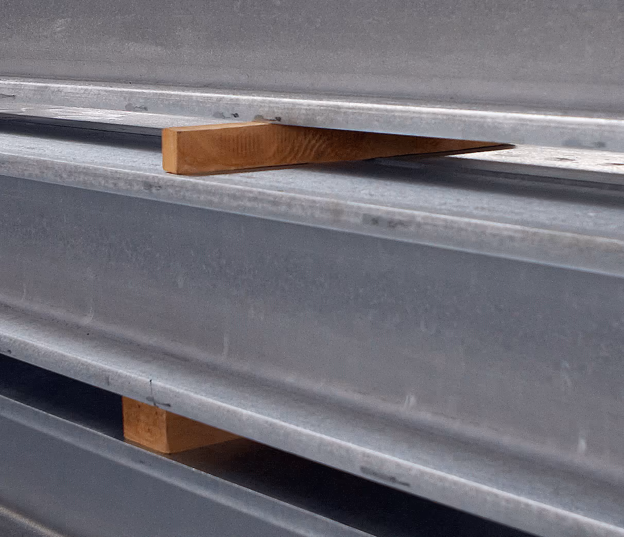 Verzinkte Stahlteile auf trockenen Unterlagen (z. B. Kanthölzer) setzen, mit etwa 150 mm Bodenabstand.