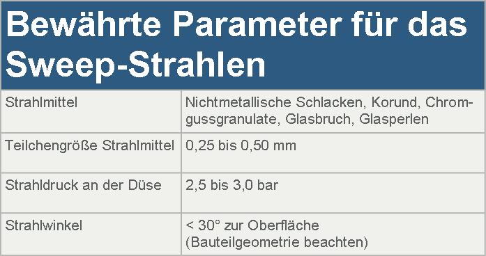 Sweep-Strahlen stellt ein sanftes Strahlen mit nichtmetallischen Strahlmitteln zum Reinigen und Anrauen der Zinkoberfläche. Nach dem Sweep-Strahlen muss die Oberfläche einheitlich matt aussehen (s. DIN EN ISO 12944-4). Parameter für das Sweep-Strahlen sind Tabelle 2 zu entnehmen.