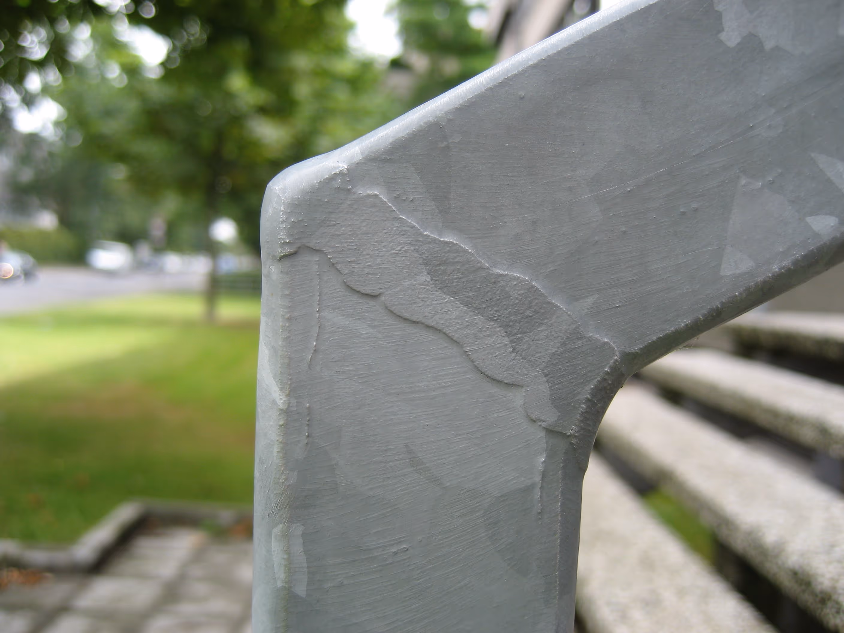 So werden beim Schweißen unter Schutzgas heute üblicherweise Schweißdrähte eingesetzt, die einen relativ hohen Silizium-Gehalt aufweisen. Dies wird insbesondere bei blecheben bearbeiteten (geschliffenen) Schweißnähten deutlich erkennbar (Abb. 3), die als Folge eines hohen Silizium-Gehaltes in der Schweißnaht an dieser Stelle einen erheblich dickeren Zinküberzug aufweisen, der sich optisch deutlich von seiner Umgebung abhebt. Dem kann, sofern für diese Anwendung zugelassen, durch gezielte Auswahl eines siliziumarmen Schweißzusatzwerkstoffes zum Teil entgegengewirkt werden, wenngleich eine vollständige Unterdrückung nur selten möglich ist.