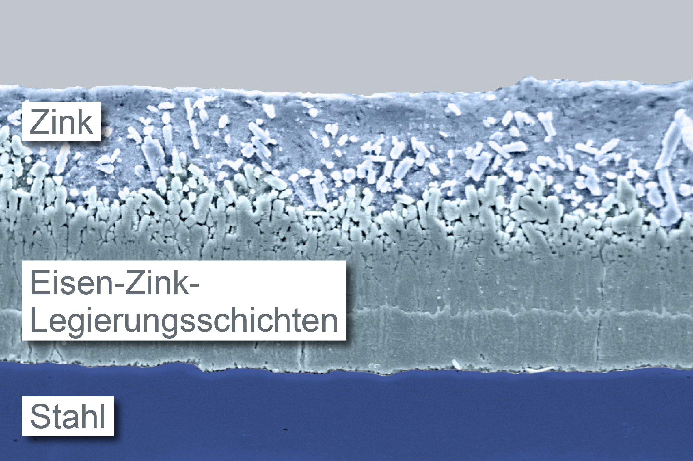 Beim Feuerverzinken werden Eisen- und Stahlteile durch Eintauchen in eine ca. 450 °C heiße Zinkschmelze mit einem Zinküberzug versehen. Dabei bilden sich auf der Oberfläche des Stahls fest mit dem Stahlwerkstoff verbundene Legierungsschichten aus Eisen und Zink (Abb. 1). Beim Herausziehen der Bauteile aus dem Zinkbad überziehen sich diese Legierungsschichten mit einer Reinzinkschicht. Dadurch entsteht normalerweise ein silbrig glänzender Überzug, teilweise mit einem ausgeprägten Zinkblumenmuster. Die Bildung der Eisen-Zink-Legierungsschichten kann allerdings mit sehr unterschiedlicher Geschwindigkeit ablaufen. Von entscheidender Bedeutung ist dabei die chemische Zusammensetzung des Stahls. Bei Stählen mit einem bestimmten Gehalt an Silizium und Phosphor kann es vorkommen, dass die Reaktion zwischen Eisen und Zink während des Verzinkungsvorganges besonders schnell abläuft und deshalb der Anteil der Eisen-Zink-Legierungsschichten im Zinküberzug stärker ausgebildet ist (Abb. 2).