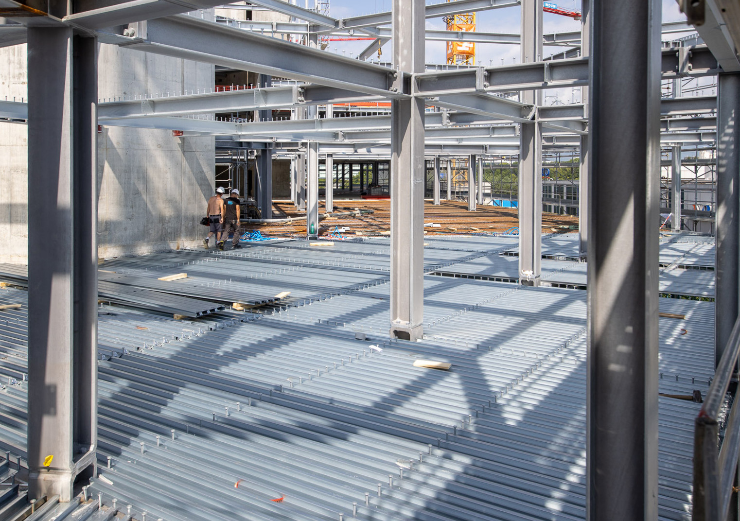 Der Brandschutz durch Feuerverzinken ist auch eine sehr gute Lösung für Geschoss- und Verbundbauten. Ein Beispiel hierfür ist das Projekt „îlot B“ in Vernier mit einer Nutzfläche von 23.255 Quadratmetern. Bei dem Büro- und Geschäftsgebäude handelt es sich um einen Verbundbau, der ein Stahlskelett mit Holorib-Verbunddecken kombiniert.Für das Projekt war eine Feuerwiderstandsdauer von 60 Minuten gefordert. Sie wird durch eine Kombination aus Sprinklerung und Brandschutz durch Feuerverzinken erzielt. Durch die Sprinkleranlage reduziert sich die geforderte Feuerwiderstandsdauer auf 30 Minuten, die dann durch die feuerverzinkte Stahlkonstruktion erreicht wird. Lediglich für die Verkaufsräume im Erdgeschoss wurde eine intumeszierende Beschichtung verwendet.