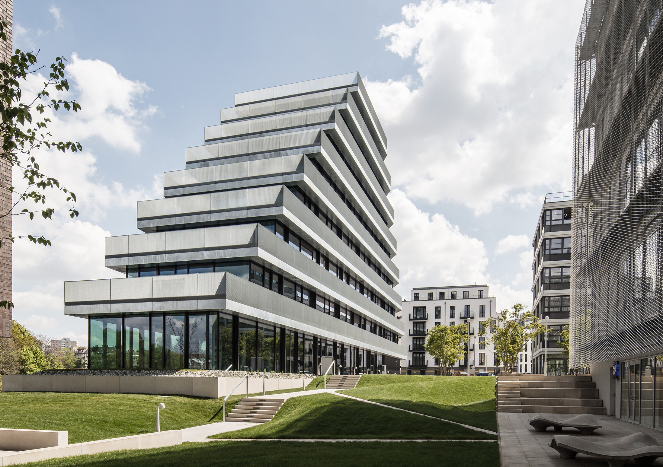 Kommentar der Jury: The Terrace befindet sich als Teil eines Ensembles aus vier Bürogebäuden an der Spree in Berlin-Charlottenburg. Mit seiner Formgebung und Höhe weckt der Acht-Geschosser Assoziationen an ein Kreuzfahrschiff. Seine umlaufend auskragenden Balkone, deren Brüstungen und Untersichten mit feuerverzinktem Stahlblech und Gitterrosten verkleidet sind, erzeugen im Wechsel mit zurückgesetzten raumhohen Verglasungen den Eindruck von übereinander schwebenden, terrassierten Ebenen. Feuerverzinkte Gitterroste als Umwehrungen prägen durch ihre materialspezifische Tiefe, Transparenz und Reflektionsfähigkeit das äußere Erscheinungsbild und kommen zusätzlich als Bodenbelag der Balkone und als Deckenbekleidung im Inneren zum Einsatz. Die Jury lobt den konsequenten Einsatz von feuerverzinkten Stahlelementen in Kombination mit Glas und Beton im gehobenen Bürobau.