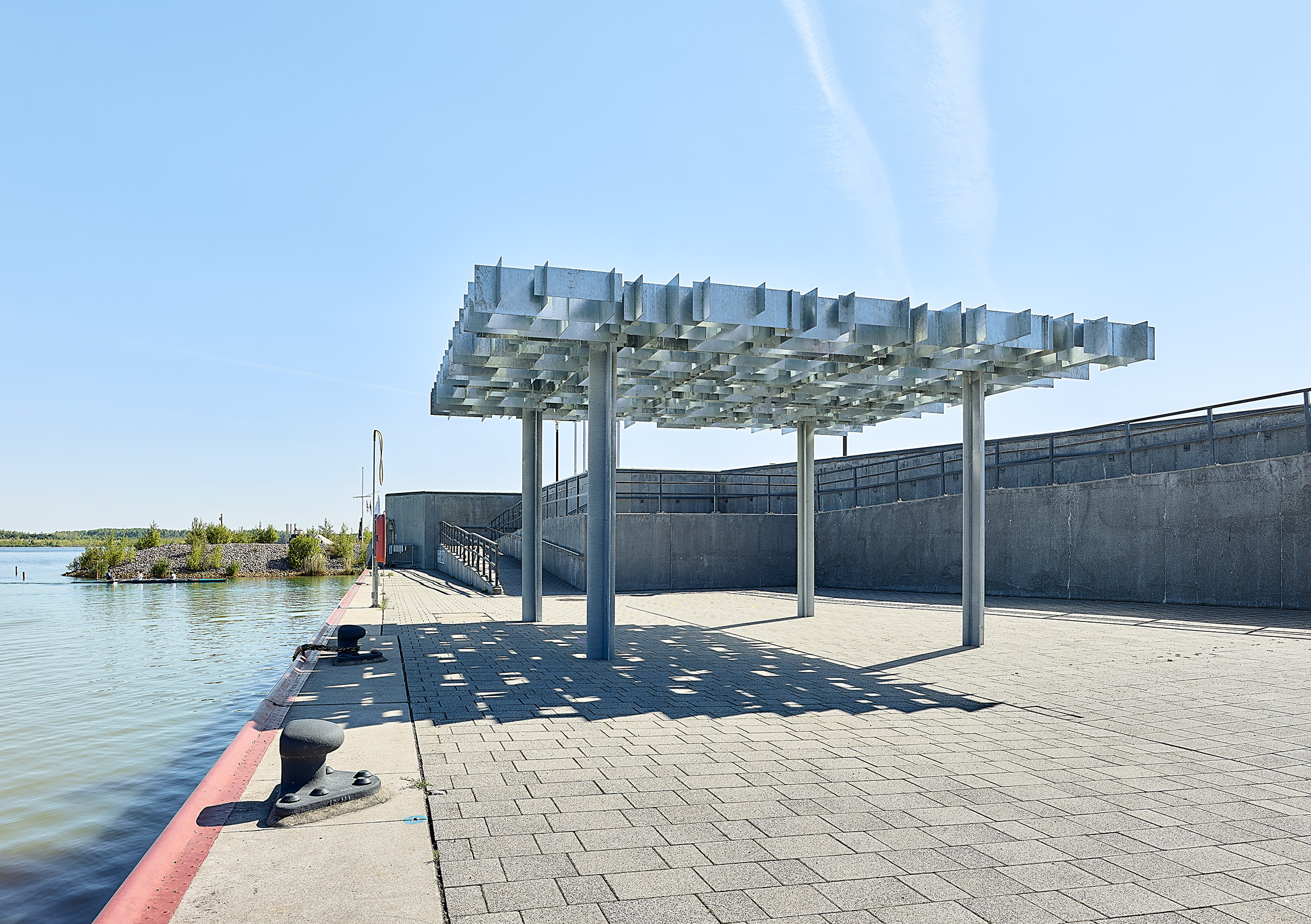 Kommentar der Jury: Der Stadtplatz am Hafen in Zwenkau ist eine massiv gebaute Freifläche, die sich im Sommer stark aufheizt, da verschattete Bereiche fehlen. Durch Knoche Architekten wurde deshalb ein Kunstwerk geschaffen, das den Platz aufwertet und wartenden Menschen Schatten spendet. Es tritt mit den natürlichen Elementen des Seeufers, vor allem aber mit dem Licht und der stets bewegten Oberfläche der großen Wasserflächen in Beziehung. Das Dach der komplett feuerverzinkten Stahlkonstruktion wird durch ein unregelmäßiges Gefüge aus senkrecht angeordneten Stahlblechlamellen mit unterschiedliche Höhen und unterschiedlichen Abständen definiert.