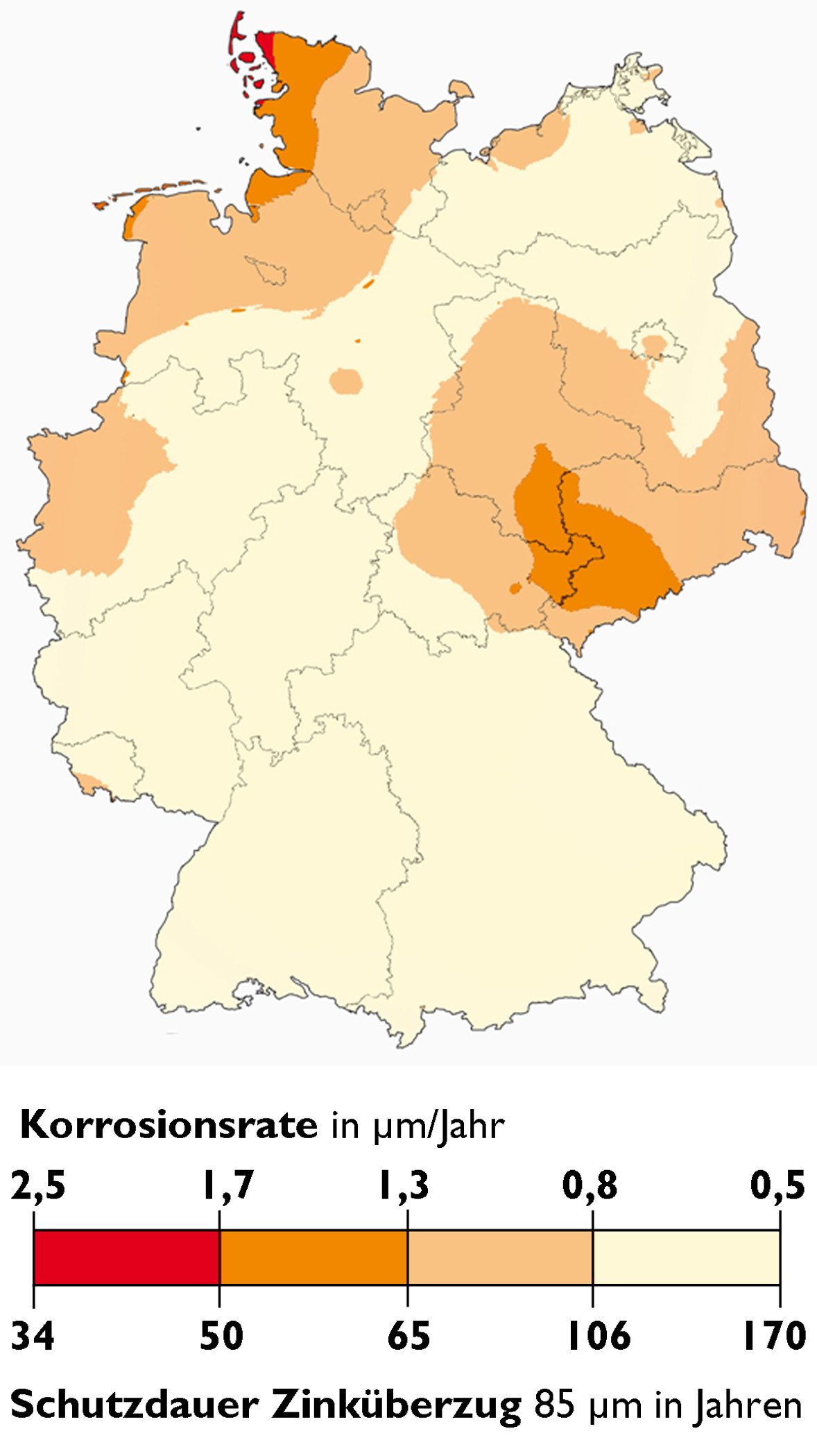 Die Wirtschaftlichkeit von Korrosionsschutzsystemen wird im Wesentlichen durch ihre Schutzdauer bestimmt. Hochwertige und damit auch langlebige Schutzsysteme sind in der Regel wirtschaftlicher als preisgünstigere, aber kurzlebige Alternativen. Auf mehr als 95 Prozent der Fläche Deutschlands herrschen nur geringe oder mittlere Korrosionsbelastungen. Eine Feuerverzinkung mit einer praxisüblichen Schichtdicke von 85 µm erreicht hier eine Schutzdauer von über 50 Jahren. Dies zeigt die vom Umweltbundesamt herausgegebene Zinkkorrosionskarte (Abb. 1).