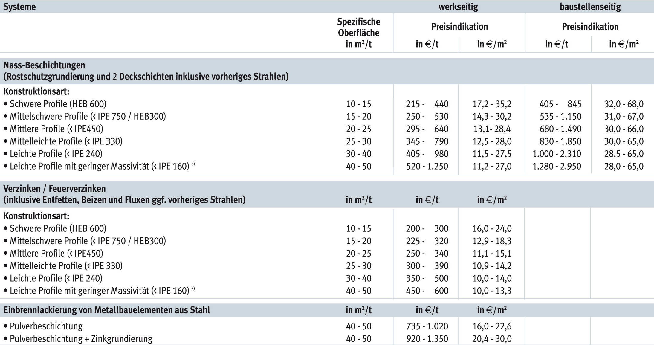 Von der unabhängigen Stahlbau-Organisation Bauforumstahl wird regelmäßig in Kooperation mit dem Institut für Bauökonomie der Universität Stuttgart und dem Conseil Européen des Economistes de la Construction eine Übersicht der Kosten im Stahlbau erhoben und herausgegeben. Die in Ausgabe 2021 gemachten Angaben zum Korrosionsschutz (Tabelle 1) zeigen, dass eine Feuerverzinkung im Vergleich zu Beschichtungssystemen in der Regel günstiger ist. Bei den Angaben ist zu berücksichtigen, dass sich Zinkpreisschwankungen auf den Feuerverzinkungspreis auswirken können. Die dargestellten Korrosionsschutzkosten beziehen sich auf Stahlbaukonstruktionen. Kosten für den Korrosionsschutz von sogenannter Schlosserware (z.B. Geländer, Zäune) sind nicht dargestellt.