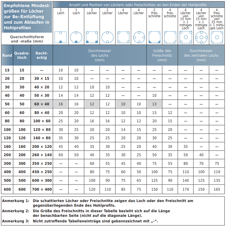 Die Größe der Öffnungen ist abhängig vom Volumen, das die Öffnungen passieren muss, das heißt vom Querschnitt und der Länge des Stahlprofils. Als Orientierung sollten die Werte der Abbildung 1 berücksichtigt werden. Grundsätzlich sollten die Öffnungen so groß wie möglich ausgebildet werden, denn die kleinste Öffnung bestimmt die Eintauchgeschwindigkeit des gesamten Bauteils. Große Öffnungen begünstigen die Oberflächenqualität des Zinküberzuges und minimieren zudem Verzugsgefahr. Die in Abb. 1 angegebenen Mindestgrößen gelten für Konstruktionen bis zu einer Länge von ca. 6 Metern. Bei längeren Profilen sind die Größe und Anzahl der Löcher entsprechend zu erhöhen. Für größere Bauteile werden in DIN EN ISO 14713-2 Ein- und Austrittsöffnungen mit 25 % des Hohlprofil-Durchmessers empfohlen.