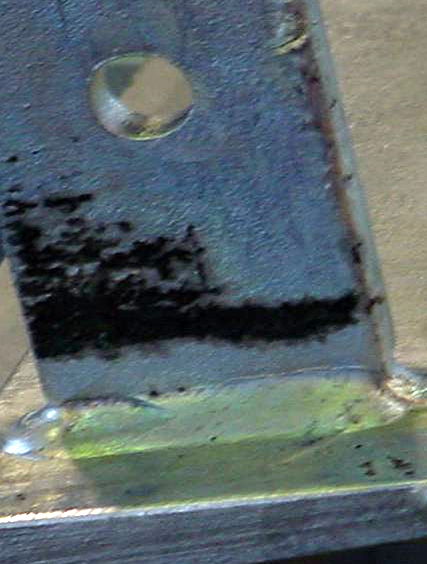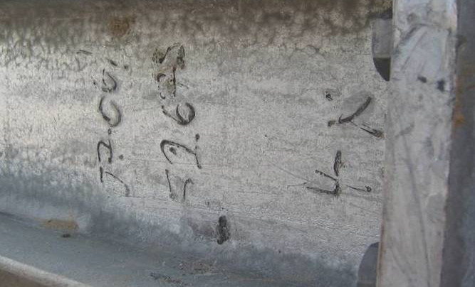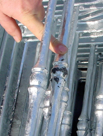 Stahlteile sind zur besseren Identifikation mitunter mit Farbkennzeichnungen signiert. Ebenso kommt es vor, dass alte Stahlteile verwendet werden, die bereits eine oder mehrere Korrosionsschutz-Beschichtungen aufweisen. Auch hier ist eine konsequente Entfernung derartiger Altbeschichtungen durch Strahlen, Schleifen oder Entlacken unbedingt erforderlich. Unterbleibt diese Maßnahme, können auch hierdurch unverzinkte Stellen im Zinküberzug entstehen. Abb. 4 zeigt ein Beispiel von unzureichender Entfernung der alten Beschichtungen. Sorgfältiges Arbeiten ist hierbei erforderlich und zahlt sich im Sinne der Endqualität aus.