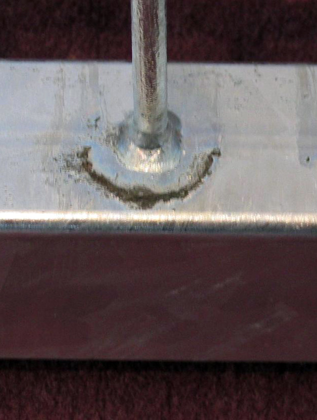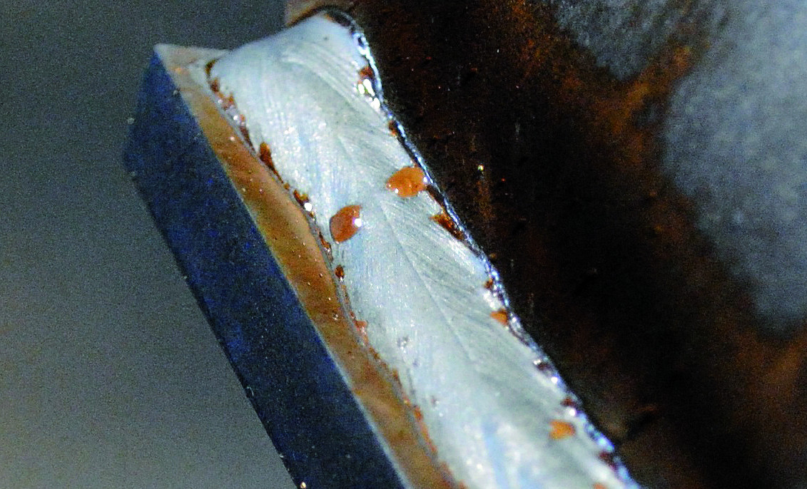 Beim Schweißen mit umhüllten Elektroden entstehen glasartige Schweißschlacken auf der Schweißnaht. Derartige Schichten müssen im Fertigungsbetrieb entfernt werden, um Fehlstellen im Zinküberzug unmittelbar auf der Schweißnaht zu vermeiden (Abb. 2). Beim Schweißen unter Schutzgas entstehen kaum sichtbare, i. d. R. leicht bräunliche, glasartige Rückstände. Es handelt sich dabei um Schlacken, die überwiegend aus Mangansilikaten bestehen und die ebenfalls zu Fehlstellen führen können. Zu den problematischen Schweißhilfsmitteln gehören Schweiß- oder Trennsprays, die dafür sorgen sollen, dass Schweißspritzer, die vor allen Dingen beim Schweißen unter Schutzgas leicht entstehen, nicht auf der Werkstückoberfläche festbrennen. Derartige Schweißsprays sind für das bloße Auge nicht sichtbar. Sie verursachen jedoch ebenfalls Fehlstellen im Zinküberzug am Rand der Schweißnaht (Abb. 3) und sollten demnach ausschließlich für ihren eigentlichen Zweck, dem Schutz des Schweißgerätes, zur Anwendung kommen. Falls derartige Schweißsprays dennoch benutzt werden, empfehlen sich silikonfreie Schweißsprays. Der Fertigungsbetrieb trägt die alleinige Verantwortung für die sichere Entfernung von Schweiß- und Trennsprays vor dem Feuerverzinken.