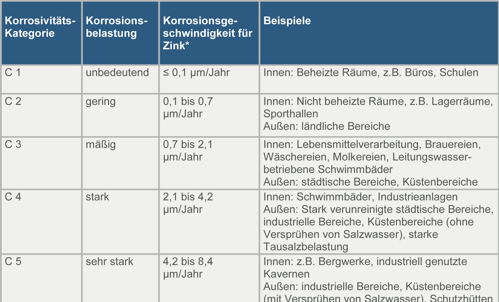 Die Norm beschreibt die unterschiedlichen Korrosivitätskategorien und gibt Informationen zur Schutzdauer und Haltbarkeit der unterschiedlichen Zinküberzüge. Im Detail werden in der Norm die typischen atmosphärischen Umgebungen zur Ableitung der Korrosivitätskategorie beschrieben. Abbildung 1 stellt die wesentlichen Informationen, vereinfacht in Anlehnung an die Norm, dar. Diese erlaubt eine konservative Abschätzung der zu erwartenden Korrosionsbelastung bzw. der Korrosionsgeschwindigkeit für Zink, angegeben in µm pro Jahr. (Basierend auf dem 1. Jahr der Auslagerung)