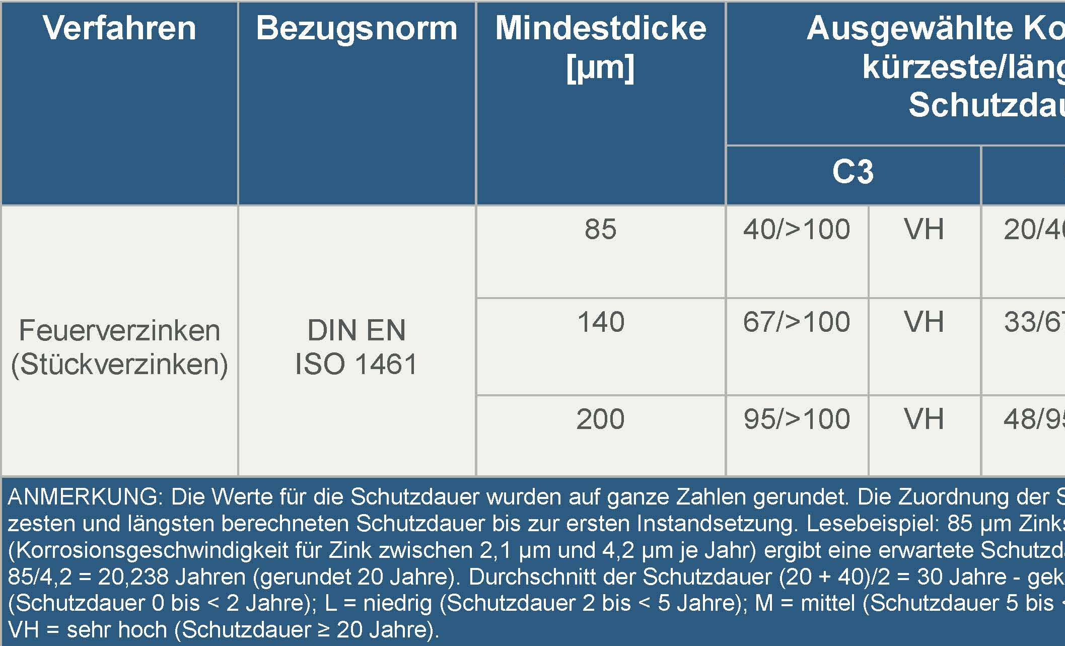 DIN EN ISO 1461 regelt die Mindestzinkschichtdicke für Stahlbauteile. Für ein Werkstück mit einer Materialdicke über 6 mm wird hier eine Mindestzinkschichtdicke von 85 µm gefordert. In der Praxis sind die Zinkschichtdicken aber verfahrensbedingt vielfach höher. Schutzdauern von 50 Jahren sind üblich und von mehr als 100 Jahren grundsätzlich möglich.