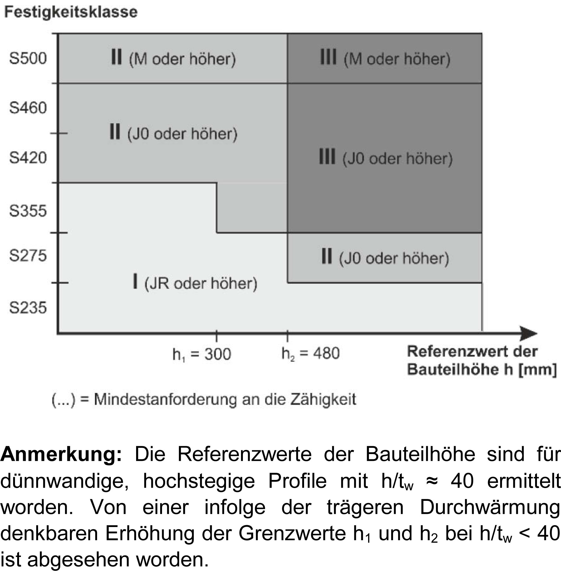 Der Referenzwert der Erzeugnisdicke ist zu bestimmen: Der Referenzwert der Erzeugnisdicke ist die maßgebliche Materialdicke, die sich über die gesamte Länge des Bauteils erstreckt. Für Walz- und Schweißprofile ist dies beispielsweise die größte Flanschdicke des jeweiligen Profils.