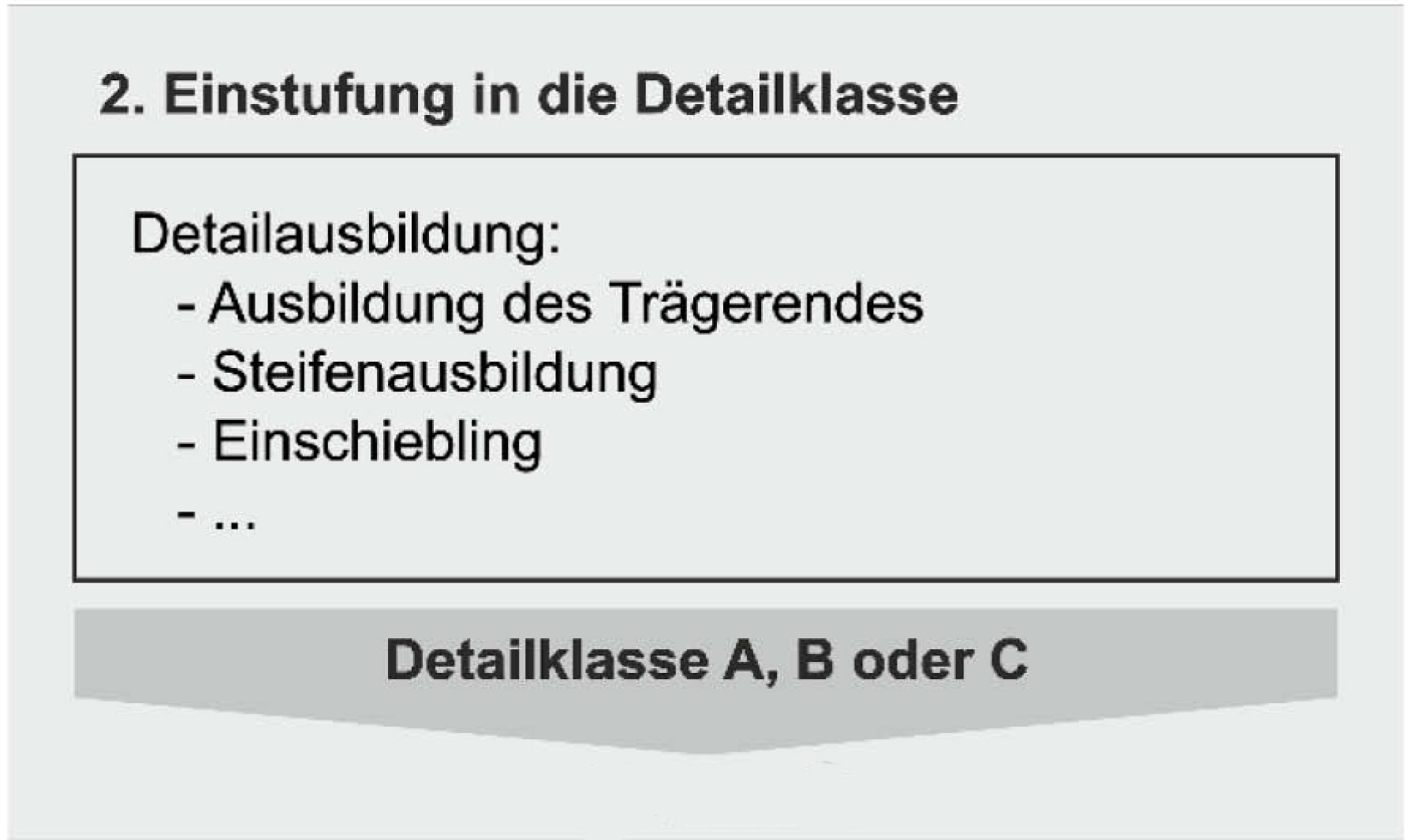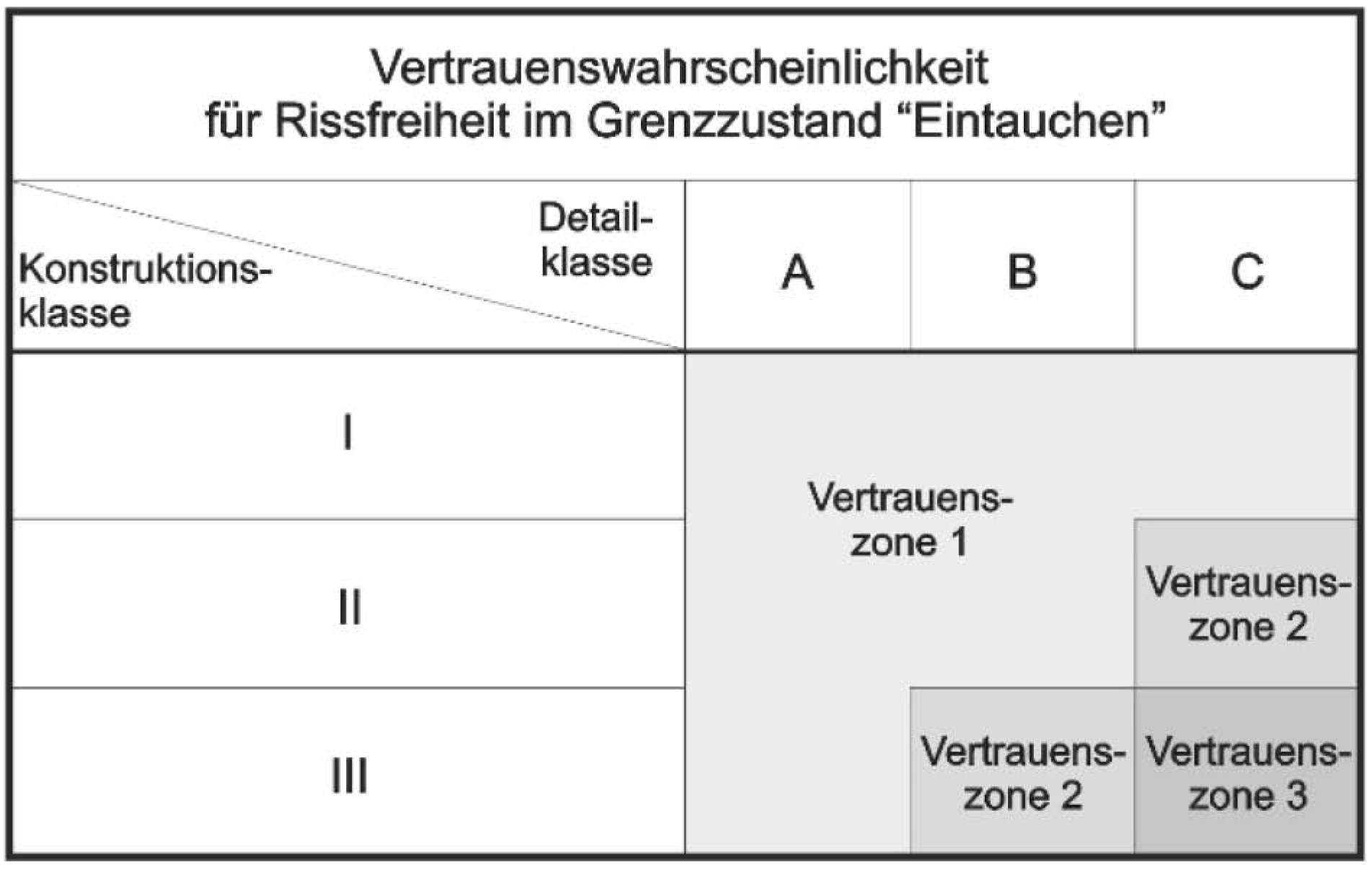 In Schritt 1 wurde die Konstruktionsklasse ermittelt und in Schritt 2 die Detailklasse. Aus diesen Angaben kann man mittels nebenstehender Tabelle die Vertrauenszone bestimmen.